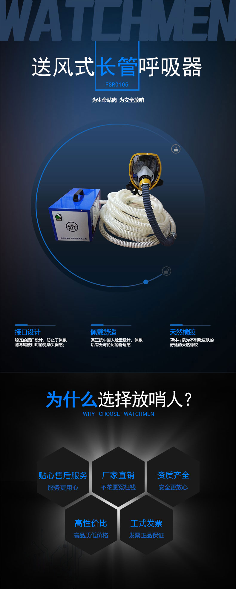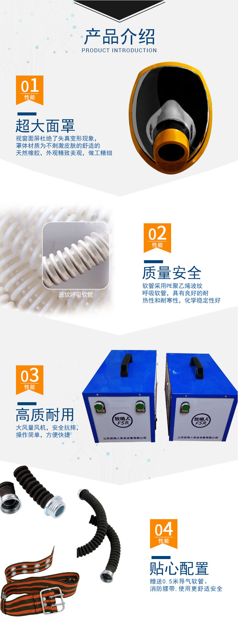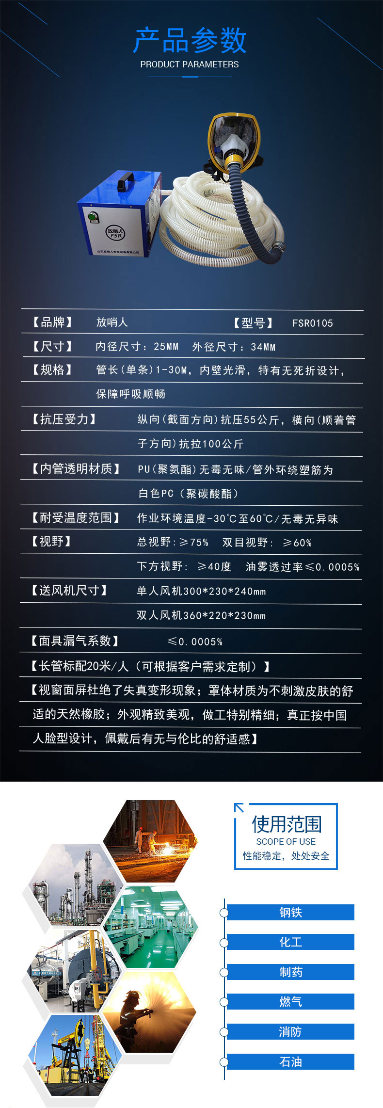 送風式長管面具是利用風機通過波紋軟管將清潔空氣送入面罩供佩戴人員呼吸的個人呼吸防護裝具。主要適用于消防特勤、化工、船舶、石油、冶金、煤氣、石油倉儲、實驗室、自來水廠、油氣田等部門,在缺氧、低濃度有毒有害氣體窄小或有限空間環境中,用以防御吸入有害氣體、蒸汽、粉塵、煙、霧。工作人員佩戴該長管面具可以安全有效地進行搶險、救災、事故處理及工業性作業。送風式長管面具只能用于不是即刻危及人體生命健康(IDLH)大氣環境或佩戴人員不需要佩戴呼吸器就能逃脫的環境。