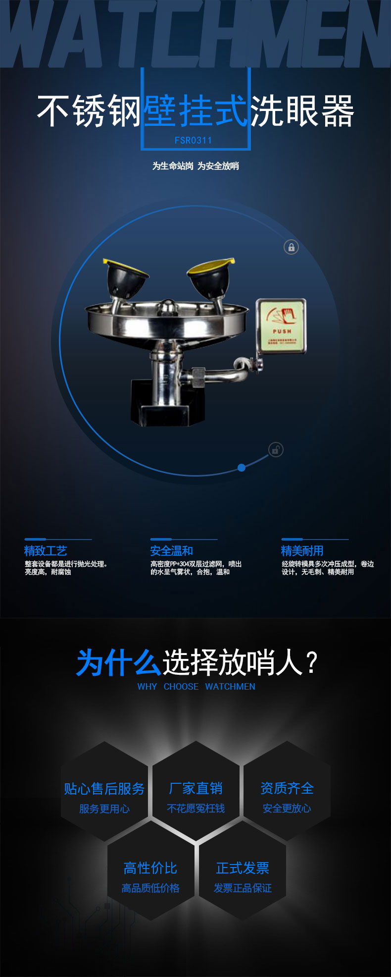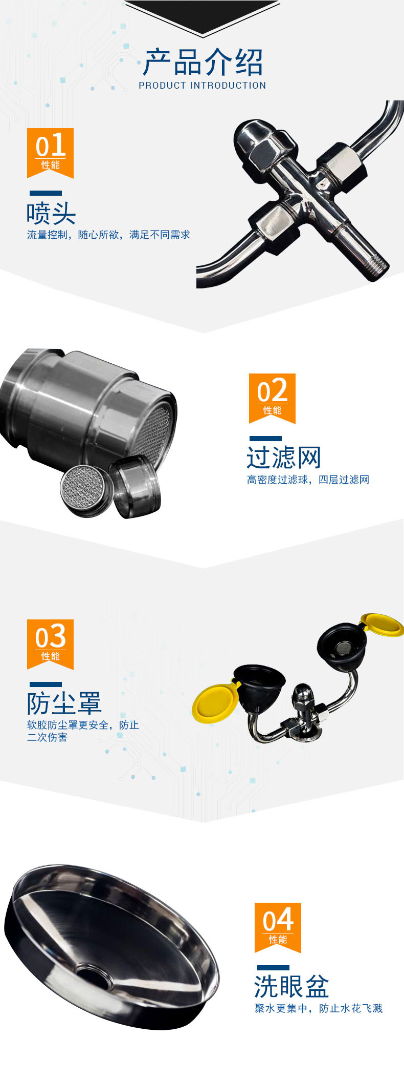 洗眼系統: 洗眼噴頭采用內置雙層PP過濾網(永不生銹),,可過濾水中雜物,水源更加清潔,另利用緩壓原理,使噴出的水流成泡沫狀,更加溫和,在使用過程中不會因水流過激對眼膜和眼睛內部神經造成二次傷害。相對傳統的洗眼器,洗眼效果更佳,更安全!