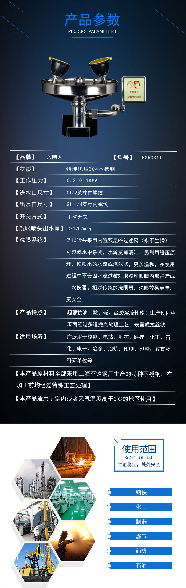 使用說明:使用時用手輕推手推閥,清潔的水自動噴出;使用結束后,關閉洗眼手推閥再把防塵蓋復位
