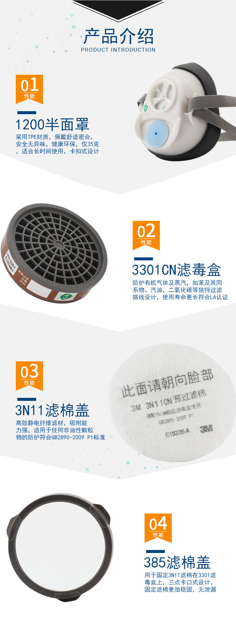 每套內含1200半面型呼吸防護面罩1個、3001CN有幾蒸汽濾盒1個、3N11CN預過濾棉2片及385CN濾棉蓋1個;