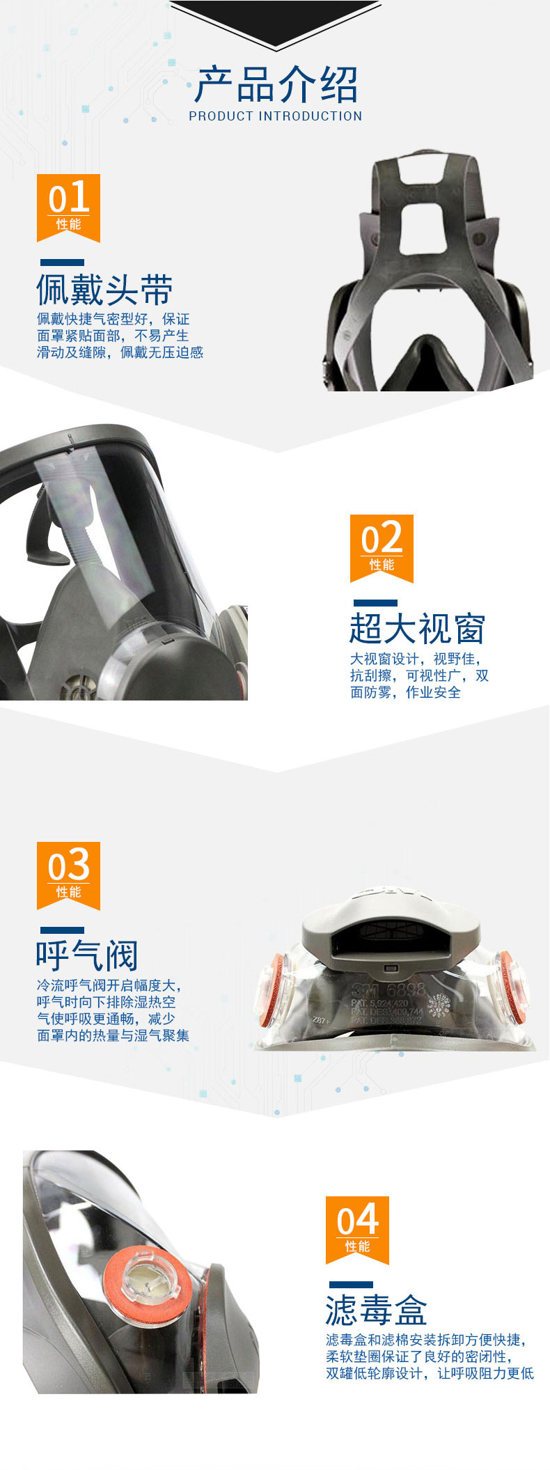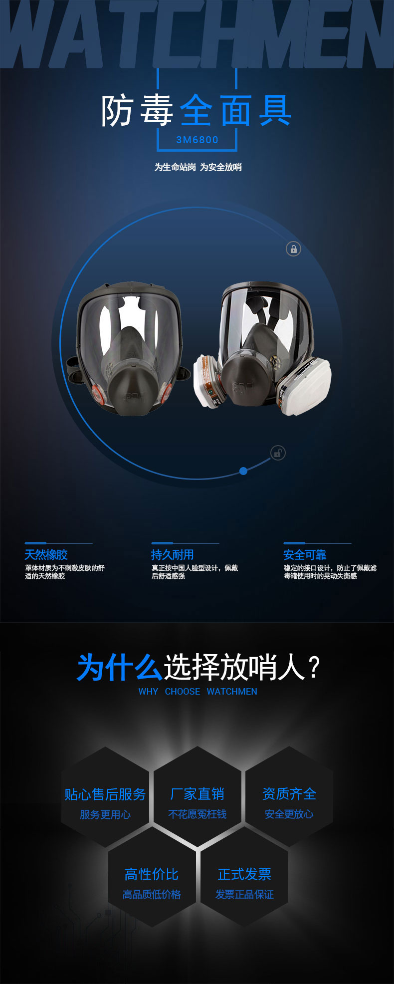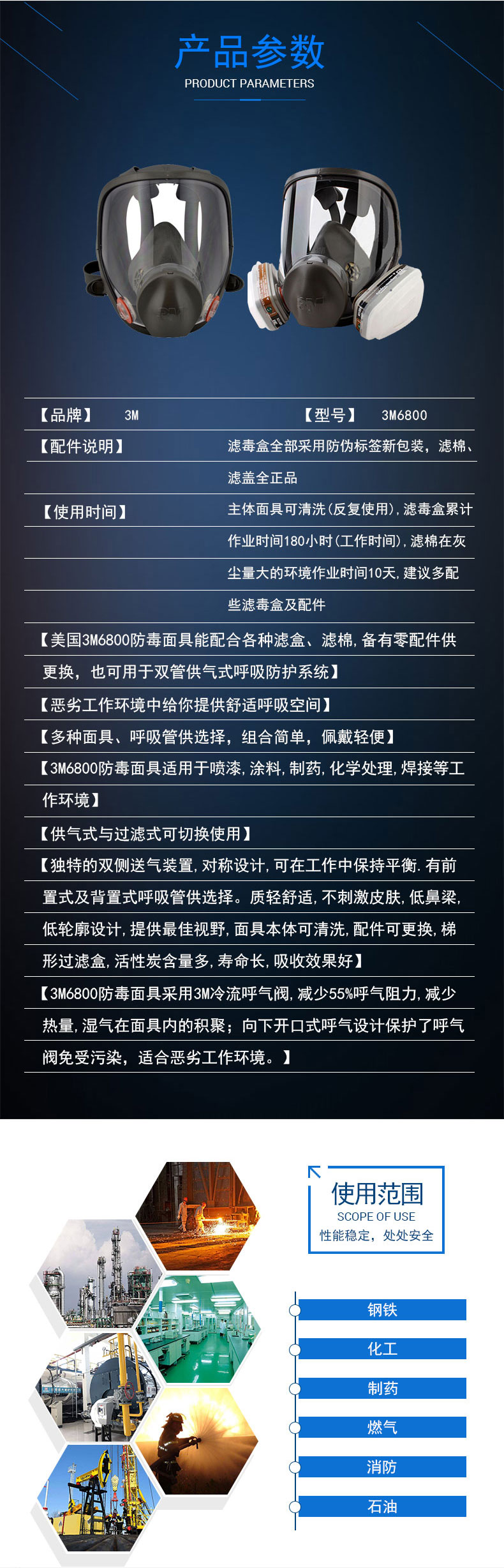 1.美國3M6800防毒面具能配合各種濾盒、濾棉,備有零配件供更換,也可用于雙管供氣式呼吸防護系統。