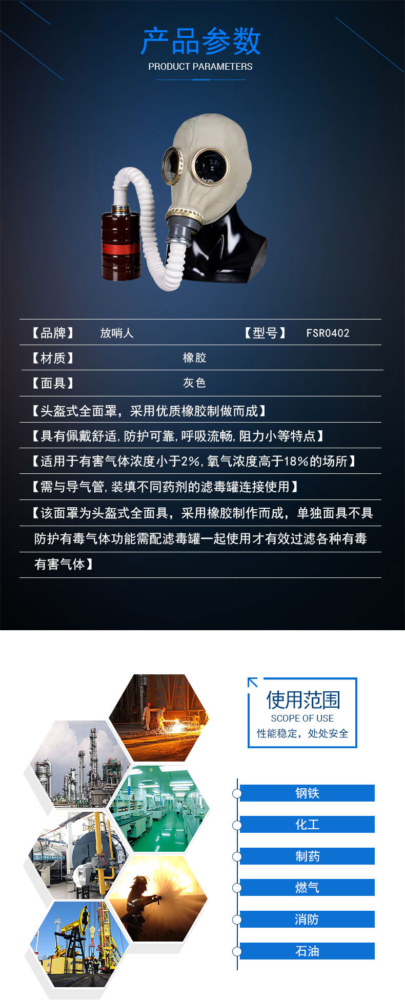 面具為橡膠材質難免會有橡膠氣味,收到貨后拆開包裝通風晾晾可減輕,感謝理解。該面罩為頭盔式全面具,采用橡膠制作而成,單獨面具不具防護有毒氣體功能需配濾毒罐一起使用才有效過濾各種有毒有害氣體。
