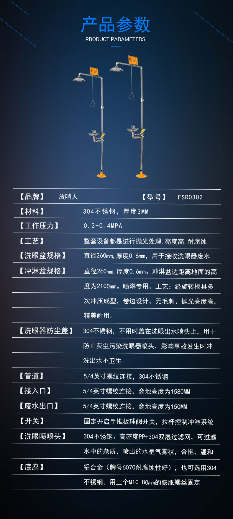 洗眼器總成:304澆鑄件精加工組成,其中90度彎管采用無縫管,無焊縫, 不會因使用時水壓造成管壁爆裂。