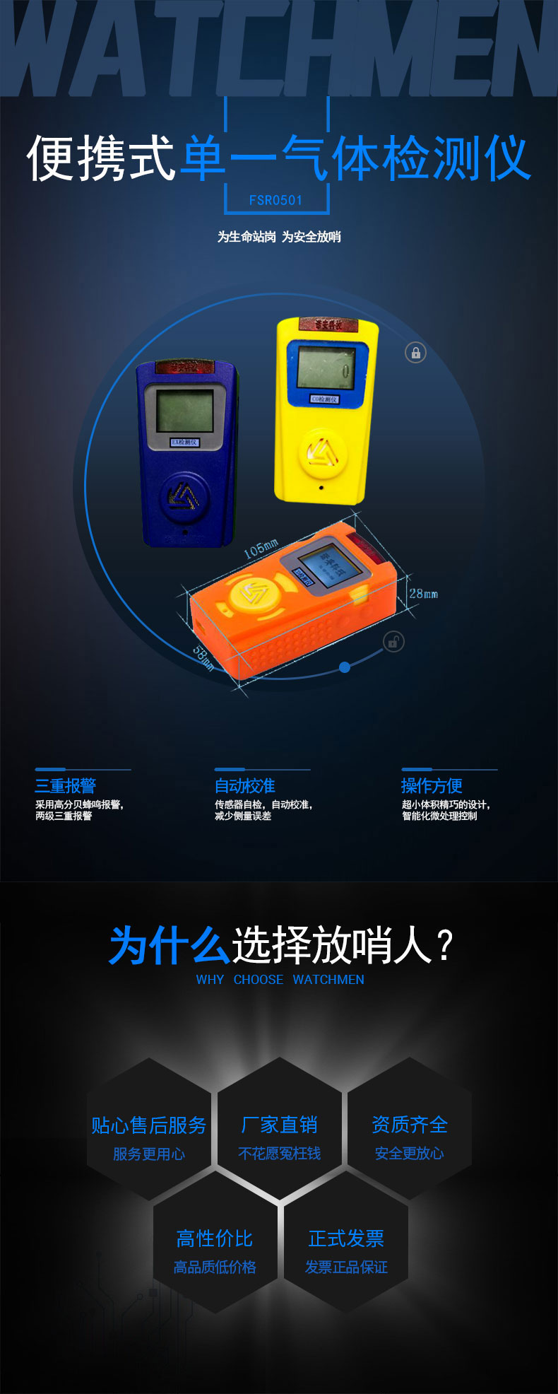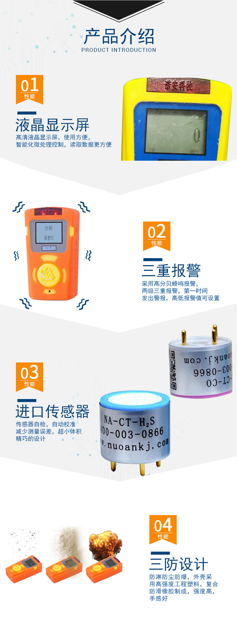 便攜式氣體探測器外殼采用高強度工程塑料,復合防滑橡膠而成,強度高、手感好,并且防水、防塵、防爆。